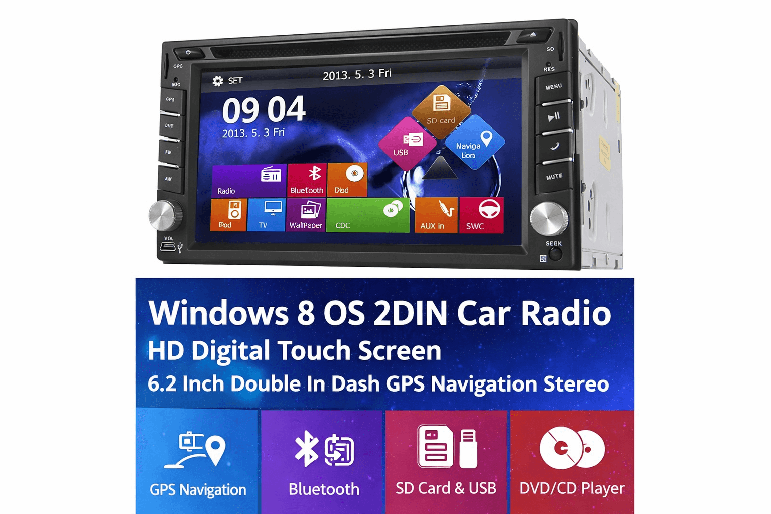 BRAND: Amazon 6.2-Inch HD Digital Touch Screen Display Double DIN In-Dash Car Stereo System Windows 8 Style Operating Interface Built-In GPS Navigation System Bluetooth Hands-Free Calling & Audio Streaming DVD/CD Player Support USB & SD Card Input Ports AUX Input Compatibility AM/FM Radio Receiver Steering Wheel Control Support Rear Camera...