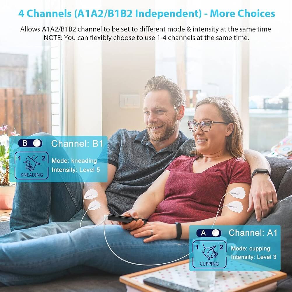 - 4 Output Channels - A/B Independent Control: TENS machine supports 2 to 8 pads used, A(A1A2) and B(B1B2) independent output channels enable users to separately target different areas on the body for a custom massage at the same time. You can set different massage modes and intensity for A/B channels respectively. You can also adjust the timer function on the unit, choosing between 10 and 60 minutes.