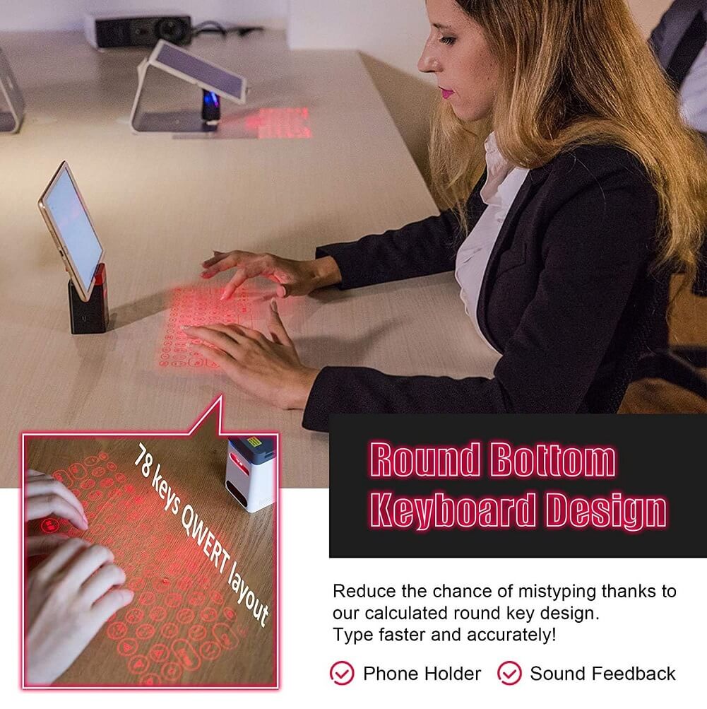 - More Accurate: The keyboard layouts of current laser projection keyboards are square keys with no space in between, so it’s very easy to mistype unwanted keystrokes.