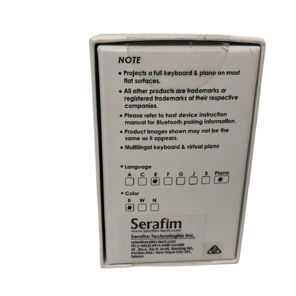BRAND: Serafim MODEL NO: SVK-01A COLOR: White Made in Taiwan English and Bopomofo Layout: This laser keyboard offers you QWERT and Taiwanese Bopomofo layout on the same projected pattern. Virtual Studio With 4+ Musical Instruments: On the road or in the studio, Serafim Keybo allows you to create your music instantly...