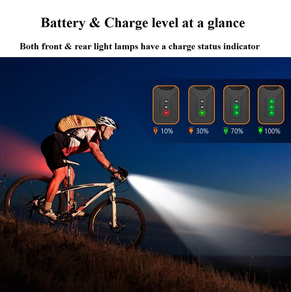 • USB Rechargeable and Battery Indicator: The charging of both bicycle lights via micro USB, whether on the PC, socket or on the go with the power bank. High-quality rechargeable 1300 mAh lithium-ion battery. The indicator always flashes and indicates that auto setting mode has been activated.