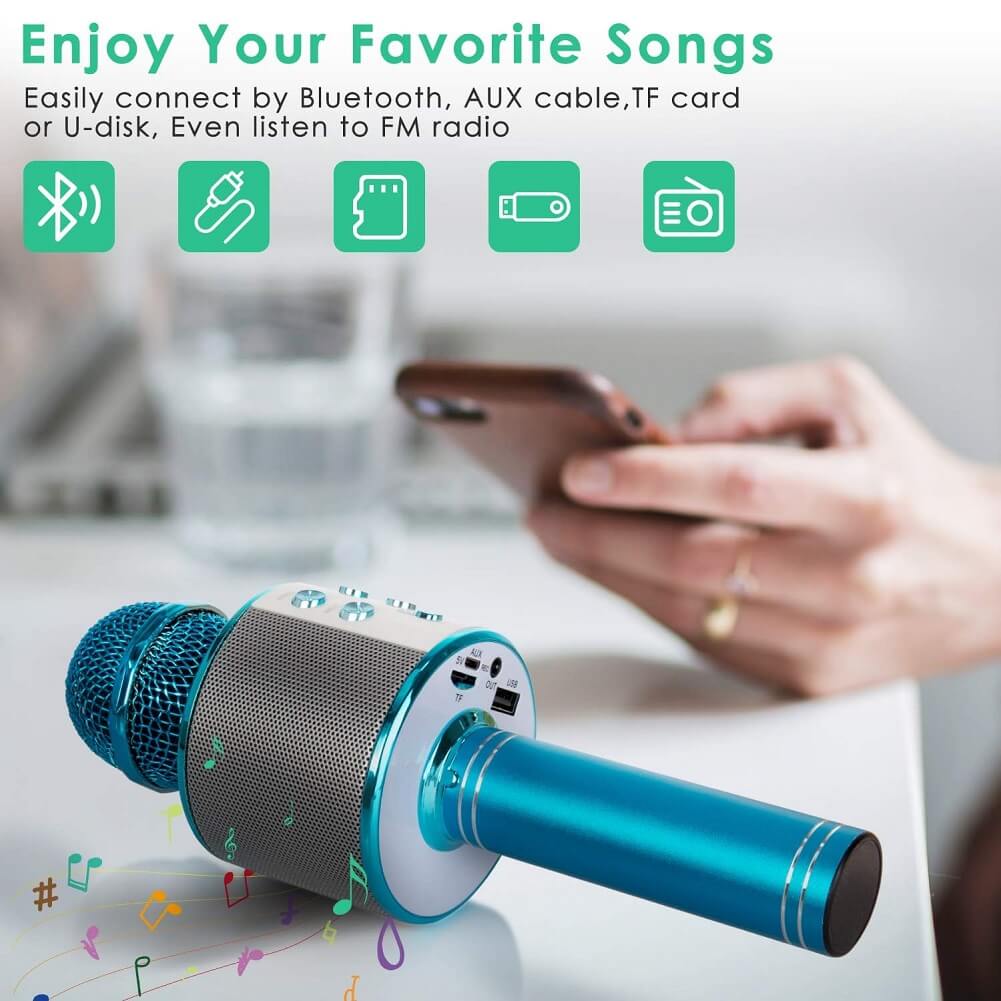 - 5-in-1 Karaoke Microphone: Portable hand-held wireless microphones can be used as microphone, Bluetooth speaker, loudspeaker, recorder. Mini home KTV for music playing and singing at any time.