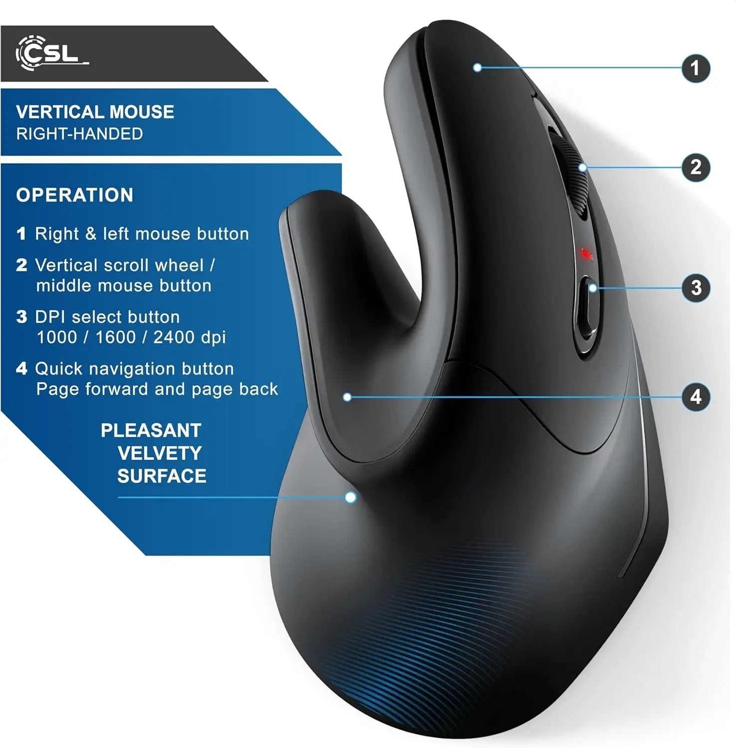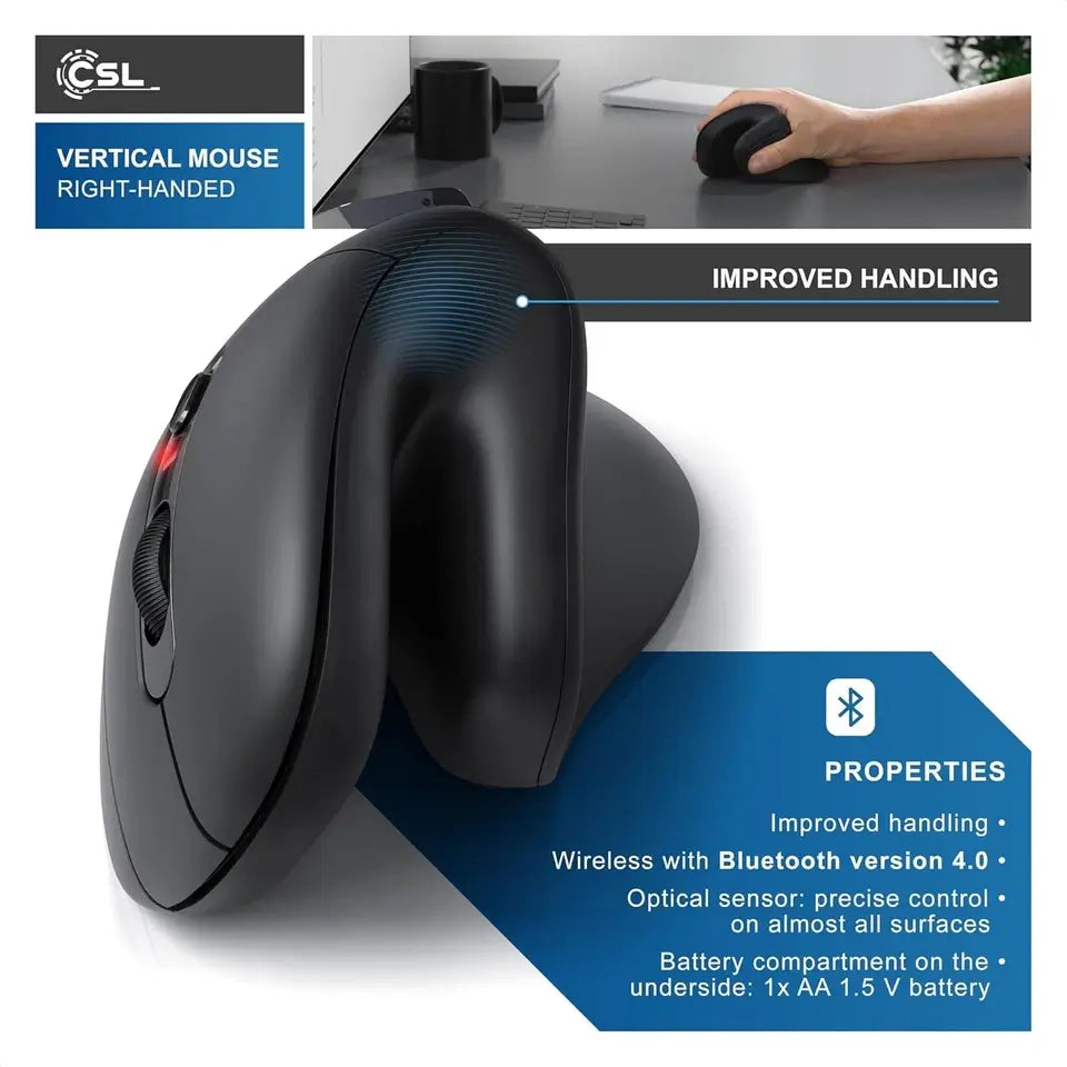 CSL Wireless Vertical Mouse, Bluetooth Optical Sensor, 1000-2400 DPI, 8 Buttons, Compatible with PC & Mac - Imported from UK