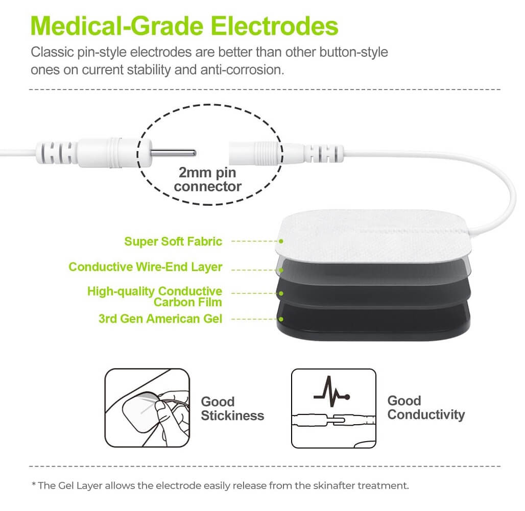 - Upgraded TENS Unit Pads: The low-impedance solid gel has been upgraded to the industry-leading American adhesive, which can provide premium self-stick performance and easy clean-up after 45 uses for a longer lifespan. Standard 2mm connector lead wires and electrodes are classic and commonly used in the medical area, which makes it easier for you to find compatible accessories.