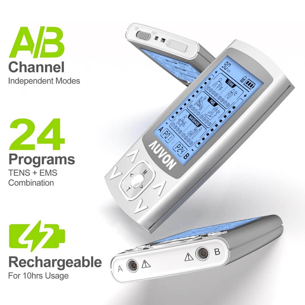AUVON Dual Channel TENS EMS Unit, 24 Modes Muscle Stimulator for Pain Relief, Rechargeable TENS Machine Massager with 6 Pads, ABS Pads Holder, USB Cable & Dust-Proof Storage Bag - Imported from UK