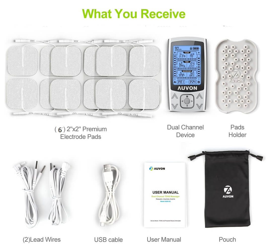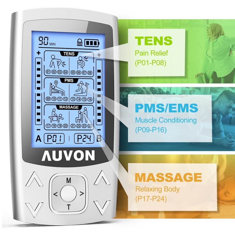 - Multi-Functional with 24 Modes: 20 levels of intensity, 24 preprogrammed massage modes with adjustable time (maximum to 90 min). With a built-in powerful rechargeable lithium battery, the AUVON rechargeable TENS unit can give you continuous use for up to 10 hours