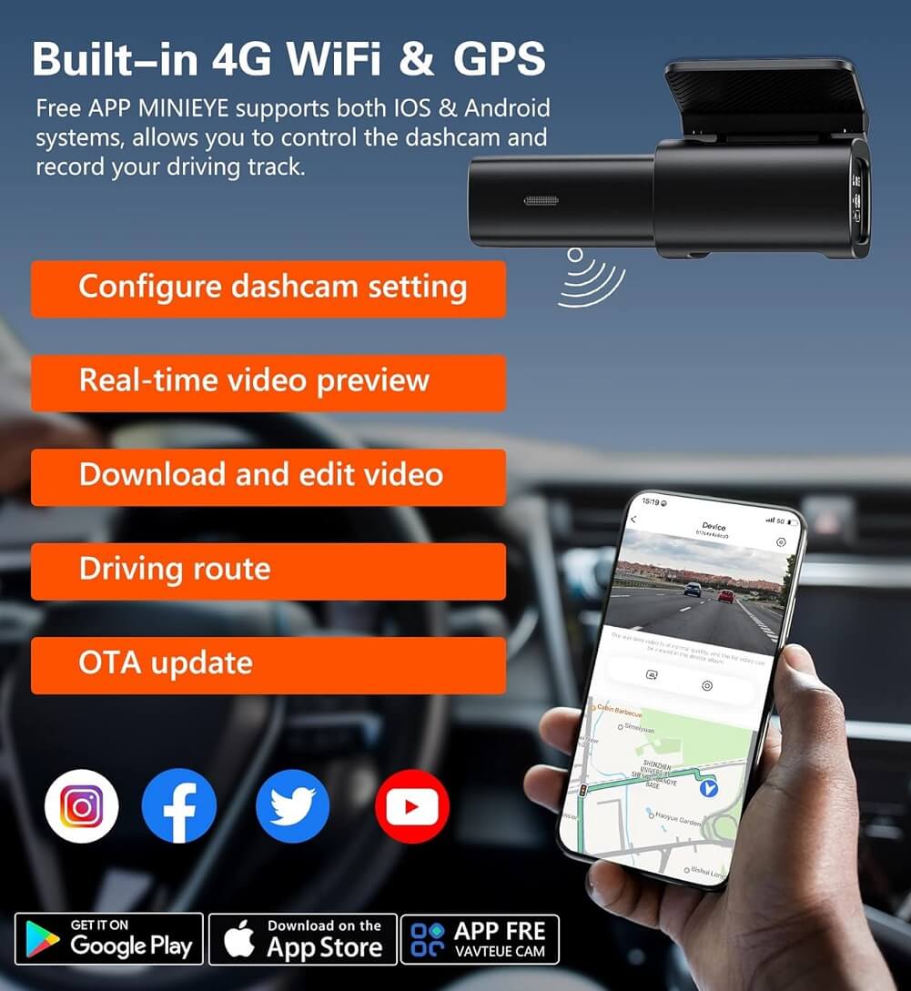 • Dash Cam Built-in 4G WiFi & Mobile APP: MINIEYE APP supports both IOS & Android systems (Android 5.0/iOS 10 and above), allowing you to view, download and share HD video to social media with friends and family, and OTA updates through Wi-Fi in real-time. Also, control MINIEYE on your phone, such as changing video resolution, volume, anti-collision functions settings and Change Wi-Fi password.