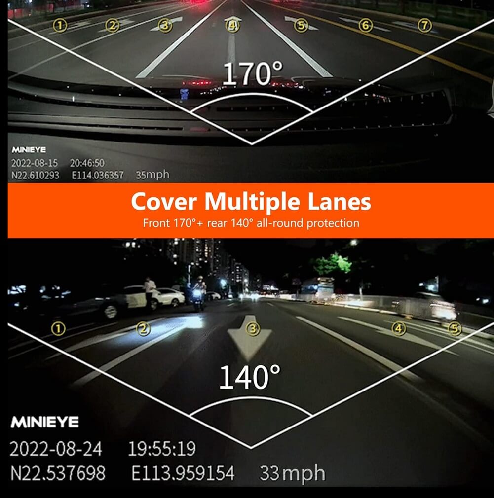 • Front and Rear Dash Cam with Parking Mode: Combined with the parking monitor function, this dash cam front and rear will keep monitoring while your car is parked, and you'll receive a notification to check the event footage in the MINIEYE app in the event of an accident. (Kind Reminder: MINIEYE Hardwire Kit (ASIN:B0B9MNGQXQ) is required and It's sold separately.)