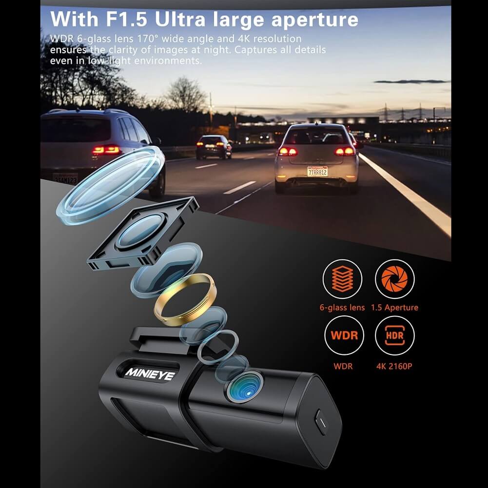 • 4K Ultra HD Car Camera Dash Cam: This car dash cam equipped with ultra 4K 2160P front camera and 1080P rear camera. 170°wide angle captures all-around details without blind spot. The front car camera equipped with an F1.5 large aperture and 6-glass lens captures important details clearly under low light conditions. (Note: The ADAS function is not available at 4K resolution!)