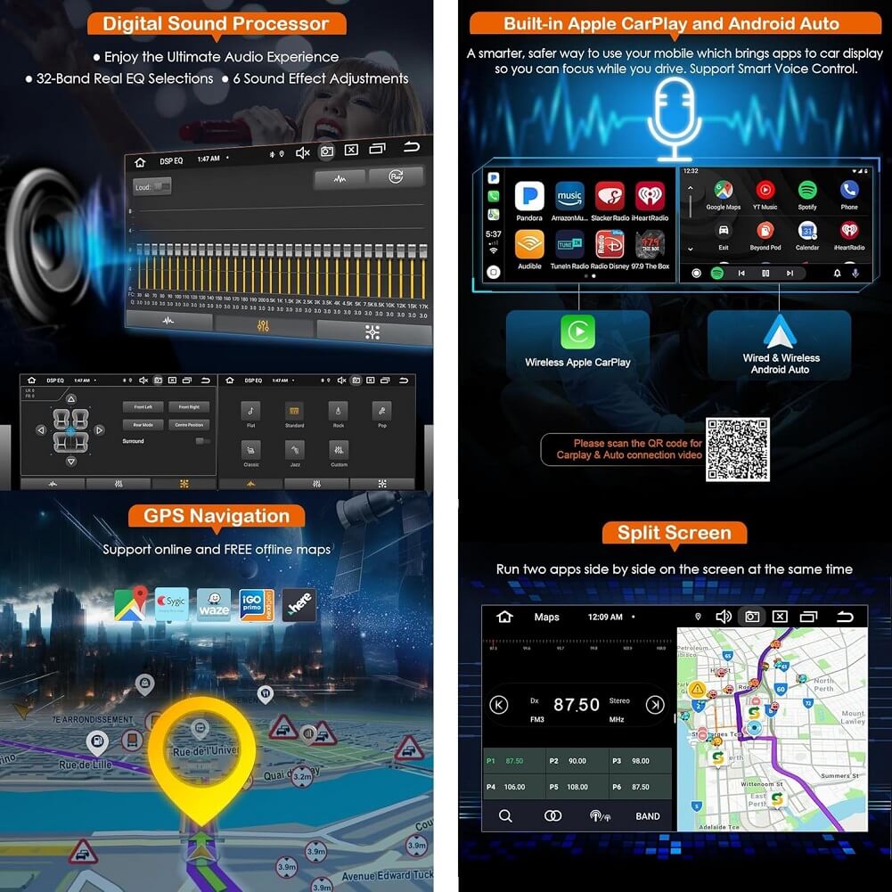 - Wireless CarPlay & Wired & Wireless Android Auto & DSP: Built-in CarPlay/Android Auto on-board chip. It allows users to make phone calls and listen to music. Just connect your iPhone to this unit via Bluetooth to use the CarPlay, or connect your Android phone via USB/Bluetooth to use Android Auto. This car radio also built-in DSP amplifier. The 30-band equalizer adapts to your taste and listening environment, bringing the perfect sound effect to your car. Music will sound clear and outstanding even at high volumes.