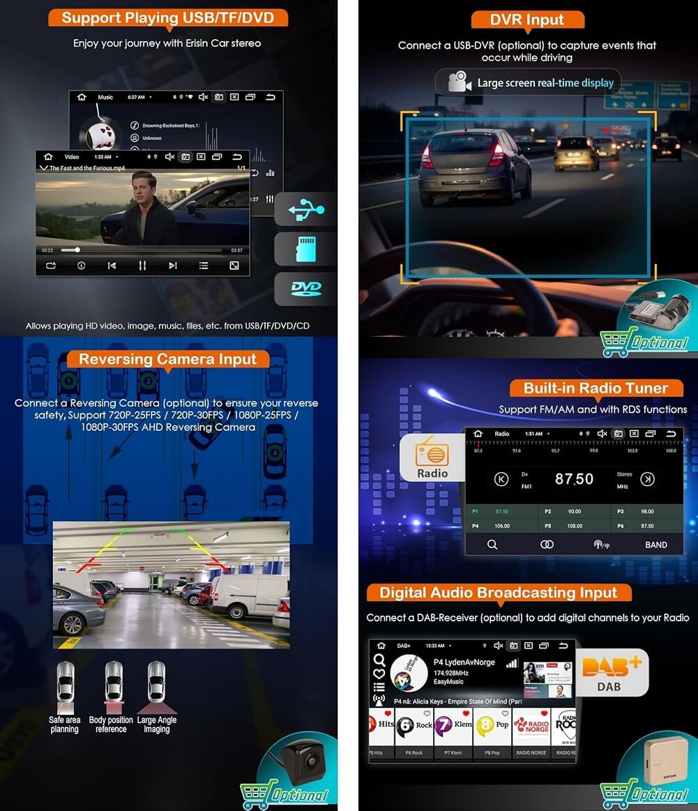 - Multi-functions: Bluetooth function can free your hands and make your driving safer; Support steering wheel control, you can use this function to control your music or volume in the car; Support Torque Pro OBD2/DVR/TPMS/TV/DAB+ system; Rear view camera input and reverse shutter control. It has built-in WiFi that allows you to surf the internet freely. Smart UI Design, support DIY wallpaper and warm or cool colors, panel light colors. Support CVBS and the newest 720P-25FPS / 720P-30FPS / 1080P-25FPS / 1080P-30FPS AHD Reversing Camera.