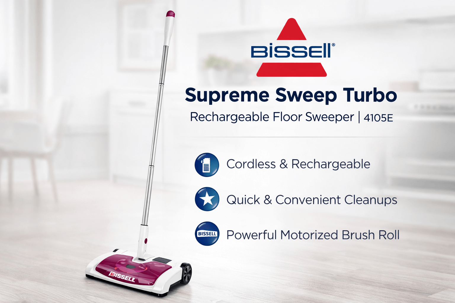 BRAND: Bissell MODEL NO: 4105E The Supreme Sweep Turbo is a cordless rechargeable sweeper, that provides a convenient and easy way to pick up daily dirt in between vacuuming. The battery-powered rotating brush quickly sweeps up large and small debris, with no effort on your part. Battery-powered brush easily sweeps hard...