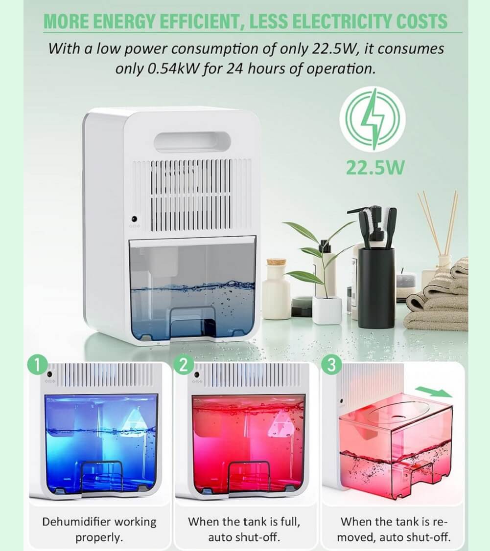 - 3 Dehumidification Modes & Energy Saving: Dehumidifier has 3 working modes (automatic mode/high efficiency mode/sleep mode), and the diversity of dehumidification performance can effectively solve the problems of window fog, air odor and wardrobe mold. The 22.5W low consumption dehumidifier is more energy efficient and environmentally friendly.