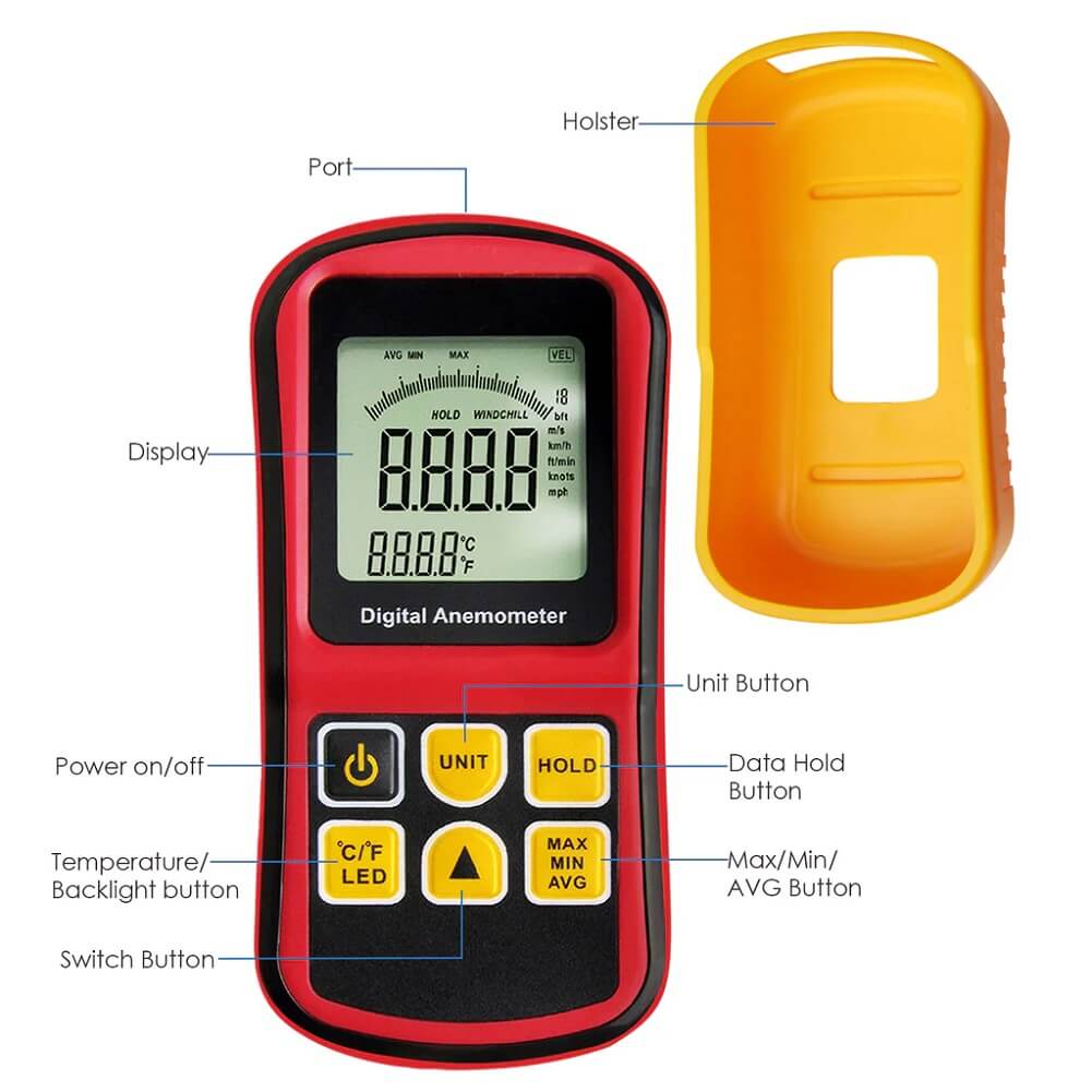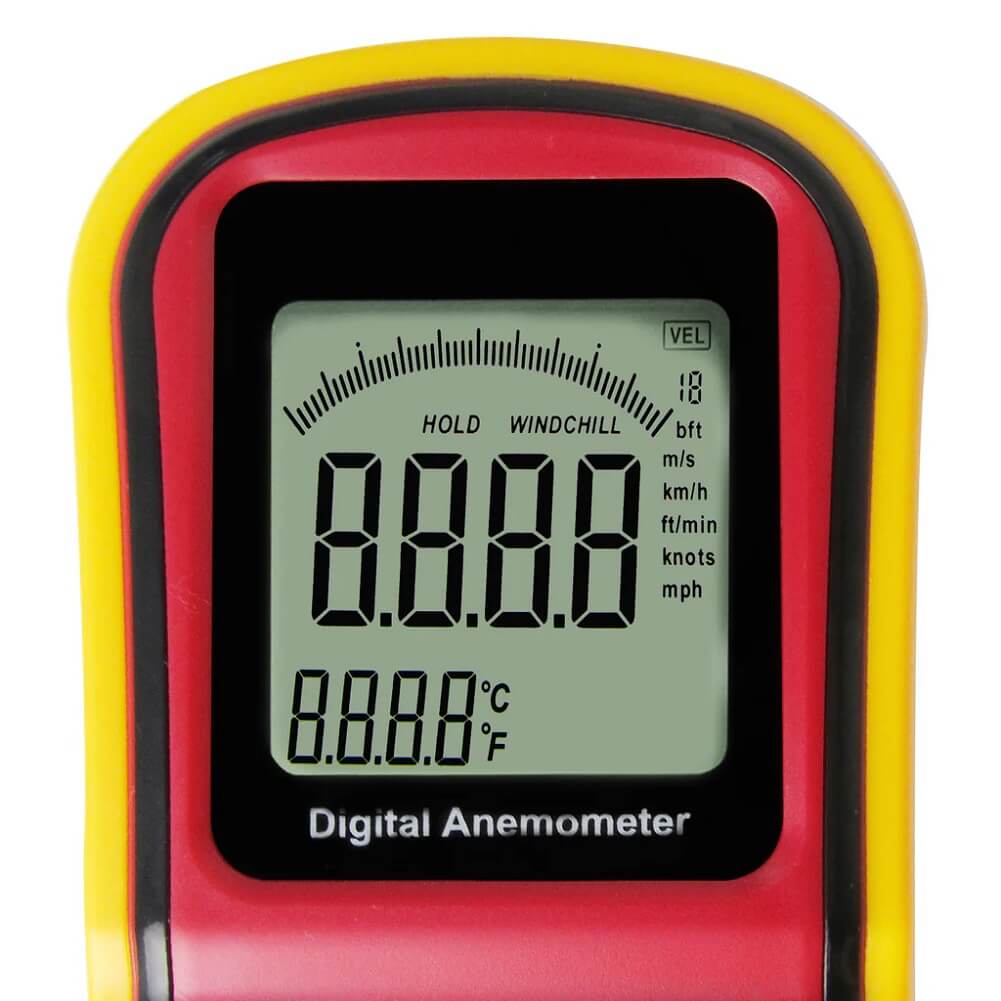 - Features an easy-to-read LCD display that shows real-time wind velocity and temperature readings.