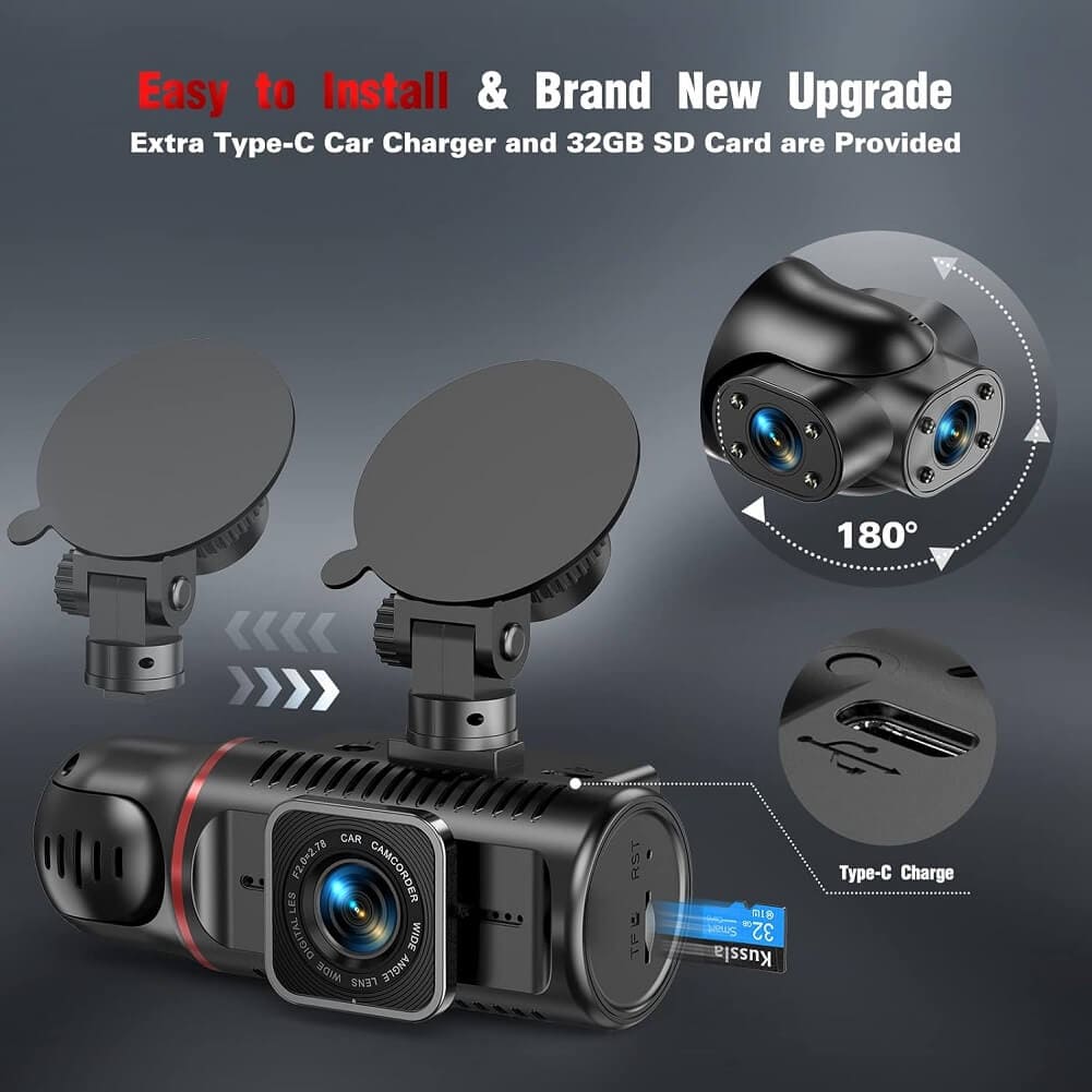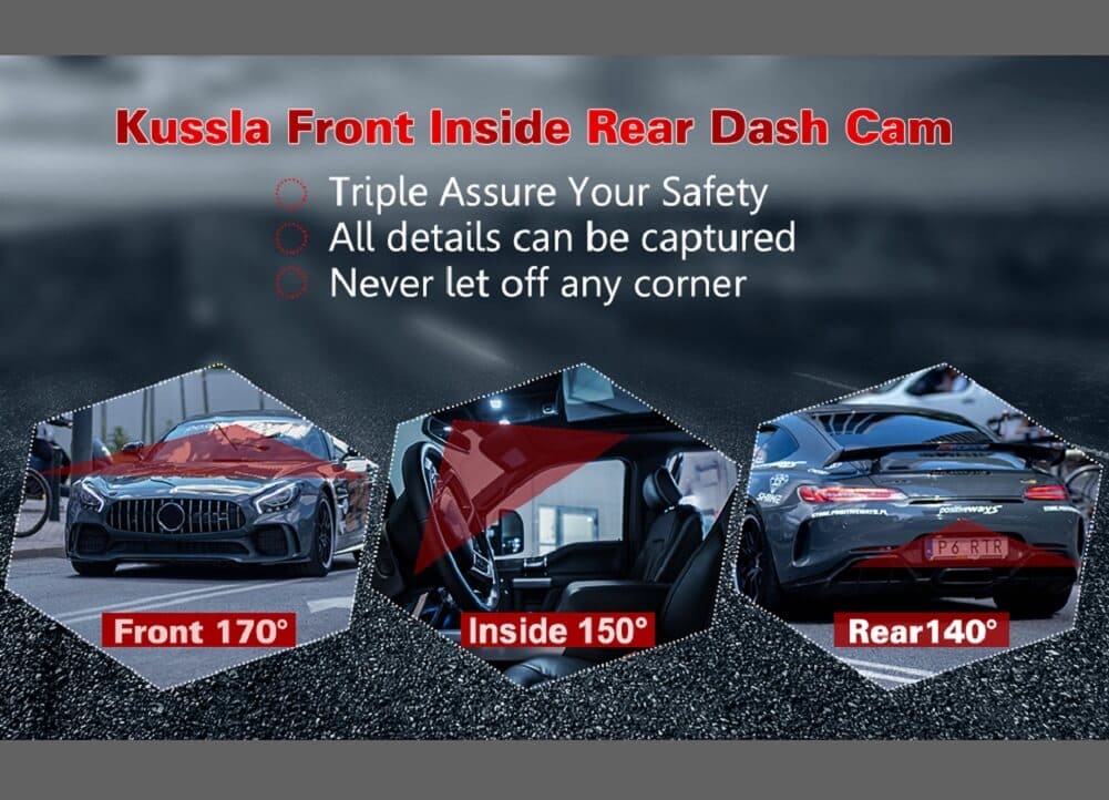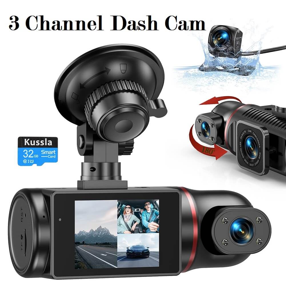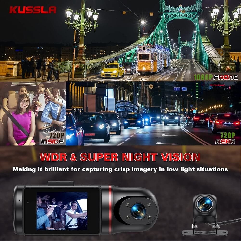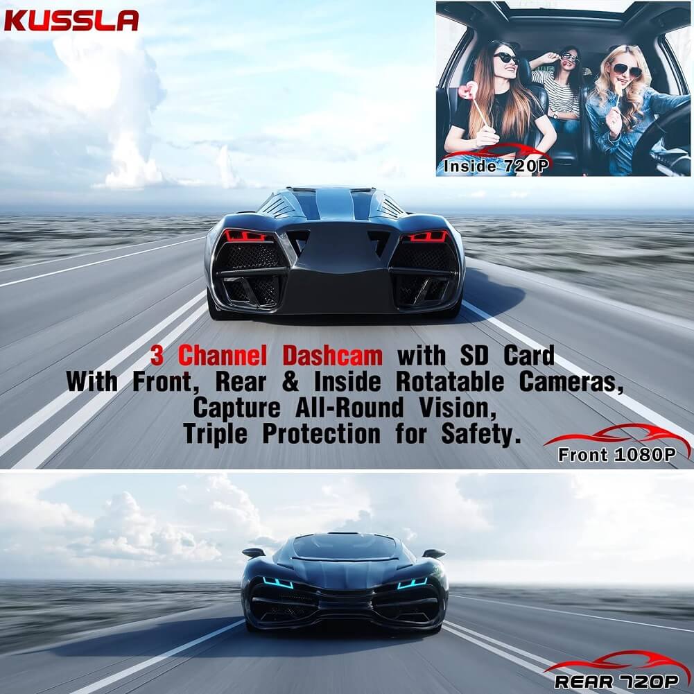 Kussla Front & Rear Inside 3 Channel 1080P Dash Cam, 3 Ways Triple Car Camera with Super Night Vision, G-Sensor, Loop Recording, WDR, Motion Detection, Parking Monitor - Imported from UK