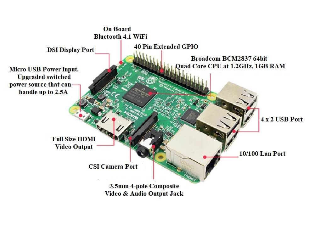 • Broadcom BCM2837B0, Cortex-A53 (ARMv8) 64-bit SoC @ 1.4GHz
